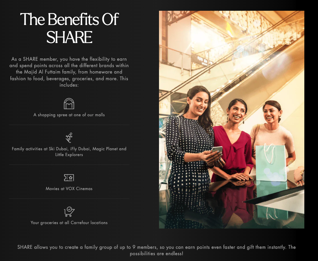 Download the app to earn points and enjoy great moments with family and friends. The Mall of the Emirates is part of the SHARE rewards programme, allowing you to earn and redeem points at all stores and restaurants within the mall.